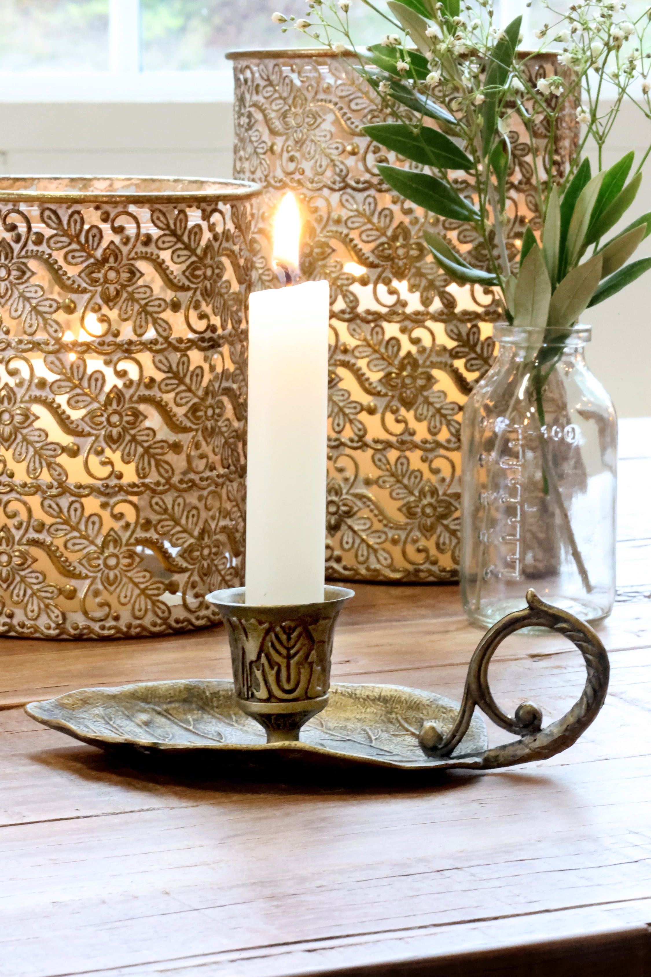 Deze verfijnde kamerkandelaar met bladmotief zorgt voor een gezellige sfeer en zet kaarslicht stijlvol in de schijnwerpers – perfect voor sfeervolle avonden of als decoratief hoogtepunt op tafel.