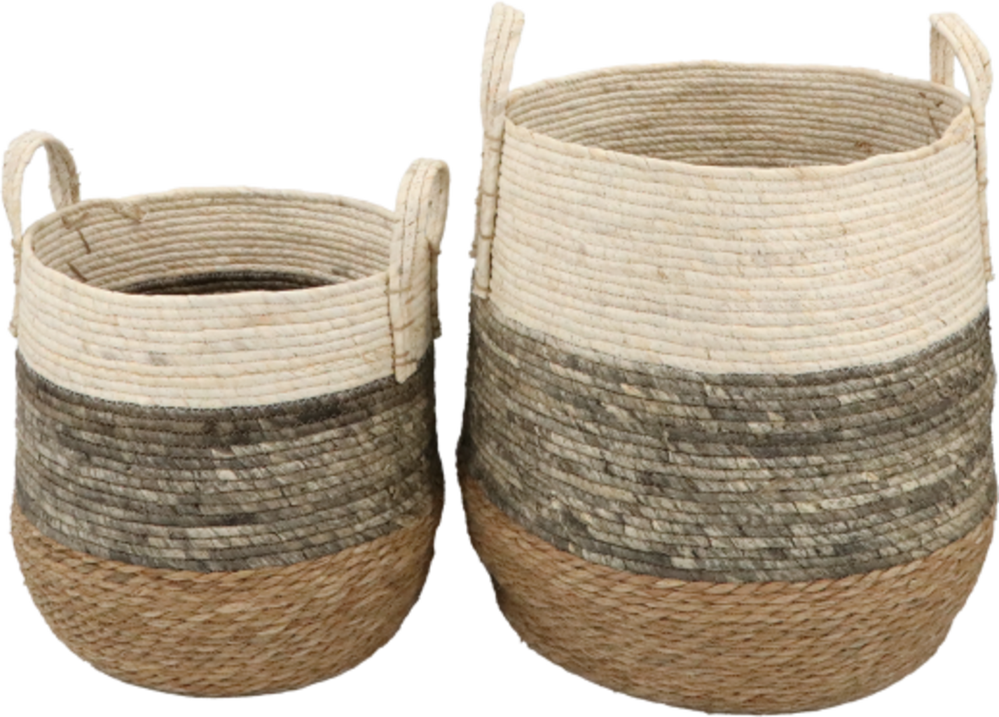 Deze handgemaakte mandenset van maïstouw en gedroogd gras maakt indruk met zijn natuurlijke look en veelzijdigheid. Als decoratieve opbergruimte in de woonkamer, voor dekens en kussens of als stijlvolle oplossing in de slaapkamer - de twee maten kunnen perfect gecombineerd worden.