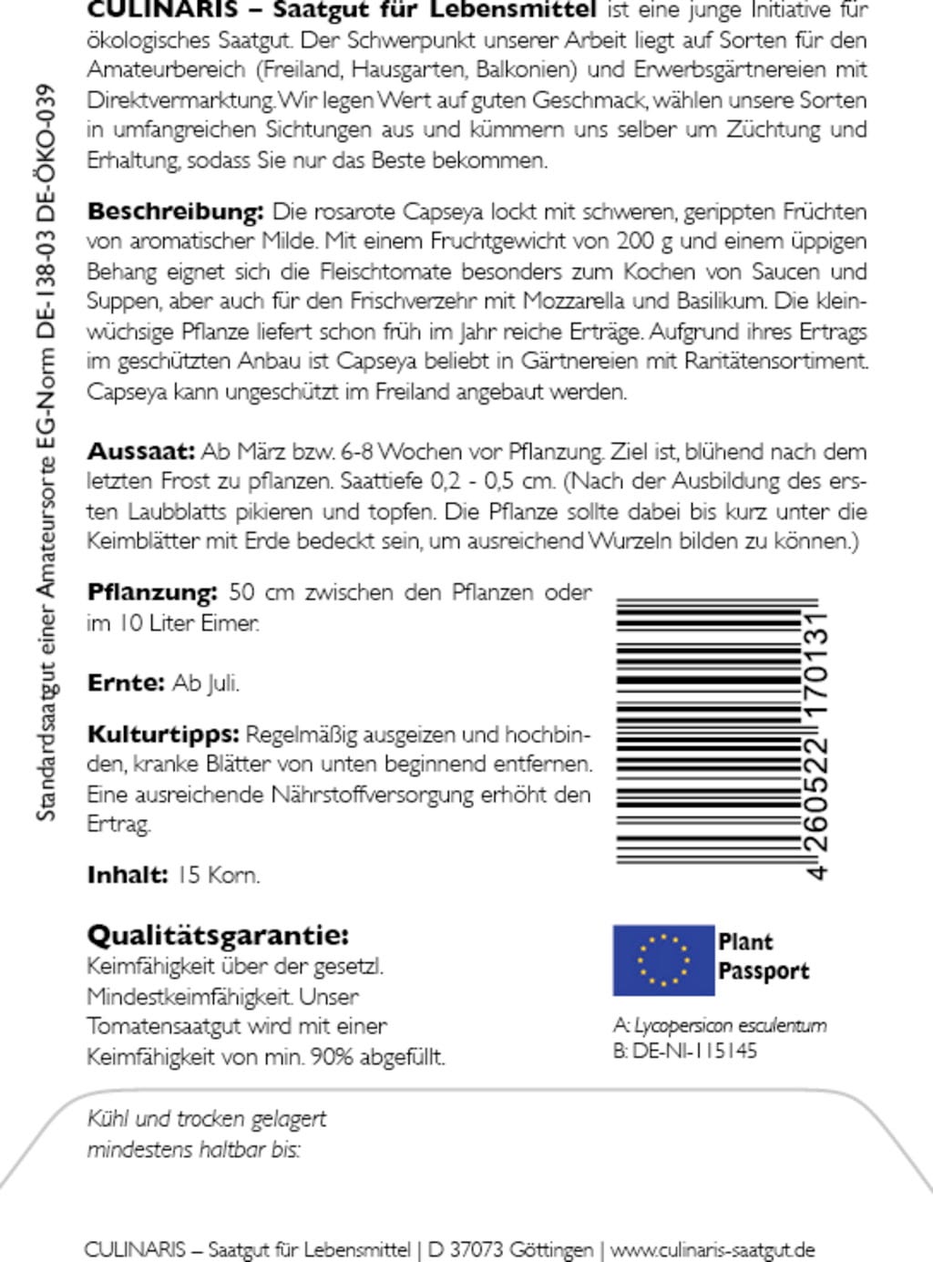 | Fabrikant: | Culinaris - Saatgut für Lebensmittel, Thiegasse 5, 37124, Rosdorf, Duitsland, info@culinaris-saatgut.de, culinaris-saatgut.de |