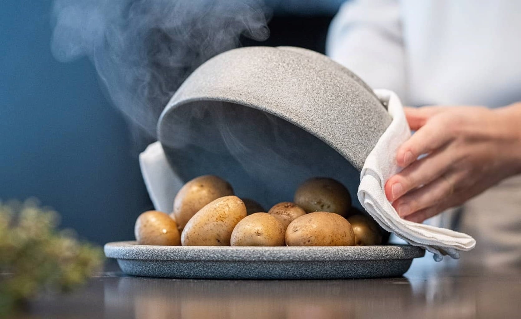 - Afdekking kan zowel als deksel en als serveerschaal worden gebruikt, waardoor de groenten lang warm blijven