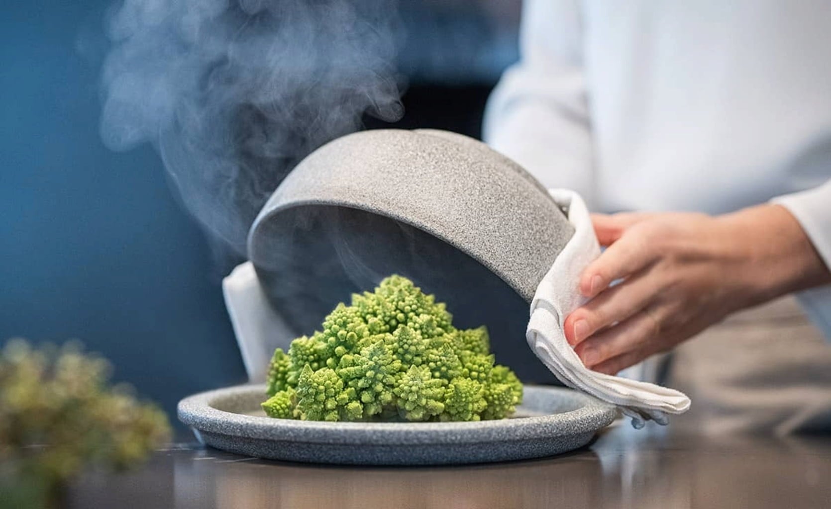 Bijzonder praktisch: Na een relatief korte energie-input kunnen de groenten verder garen onder de gesloten afdekking. Zo hebben bijvoorbeeld broccoli of bloemkool slechts 5 minuten energie nodig, om daarna nog 5 minuten onder de deksel door te garen.
