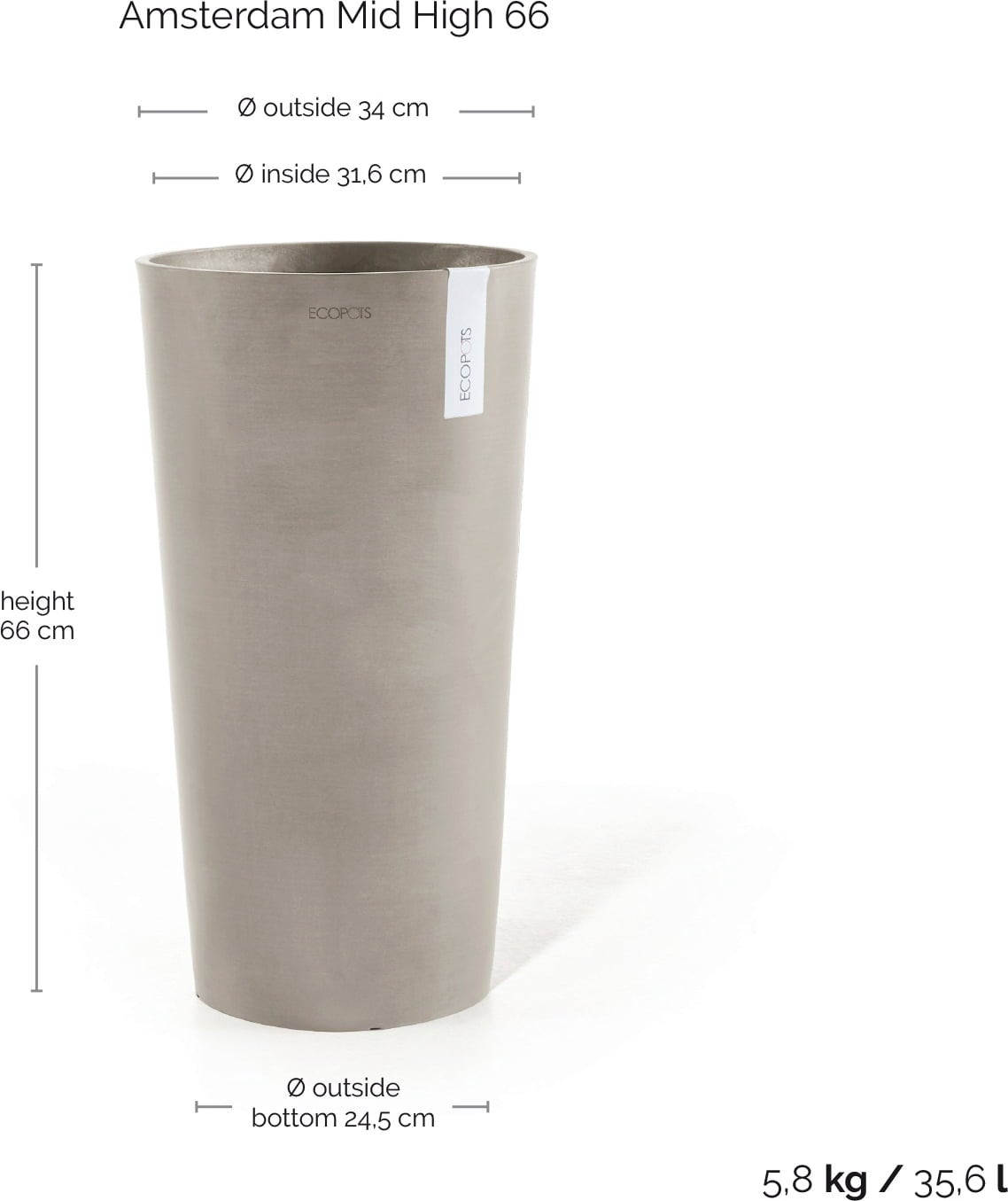 Ecopots Amsterdam Bloempot Mid High 66, Taupe