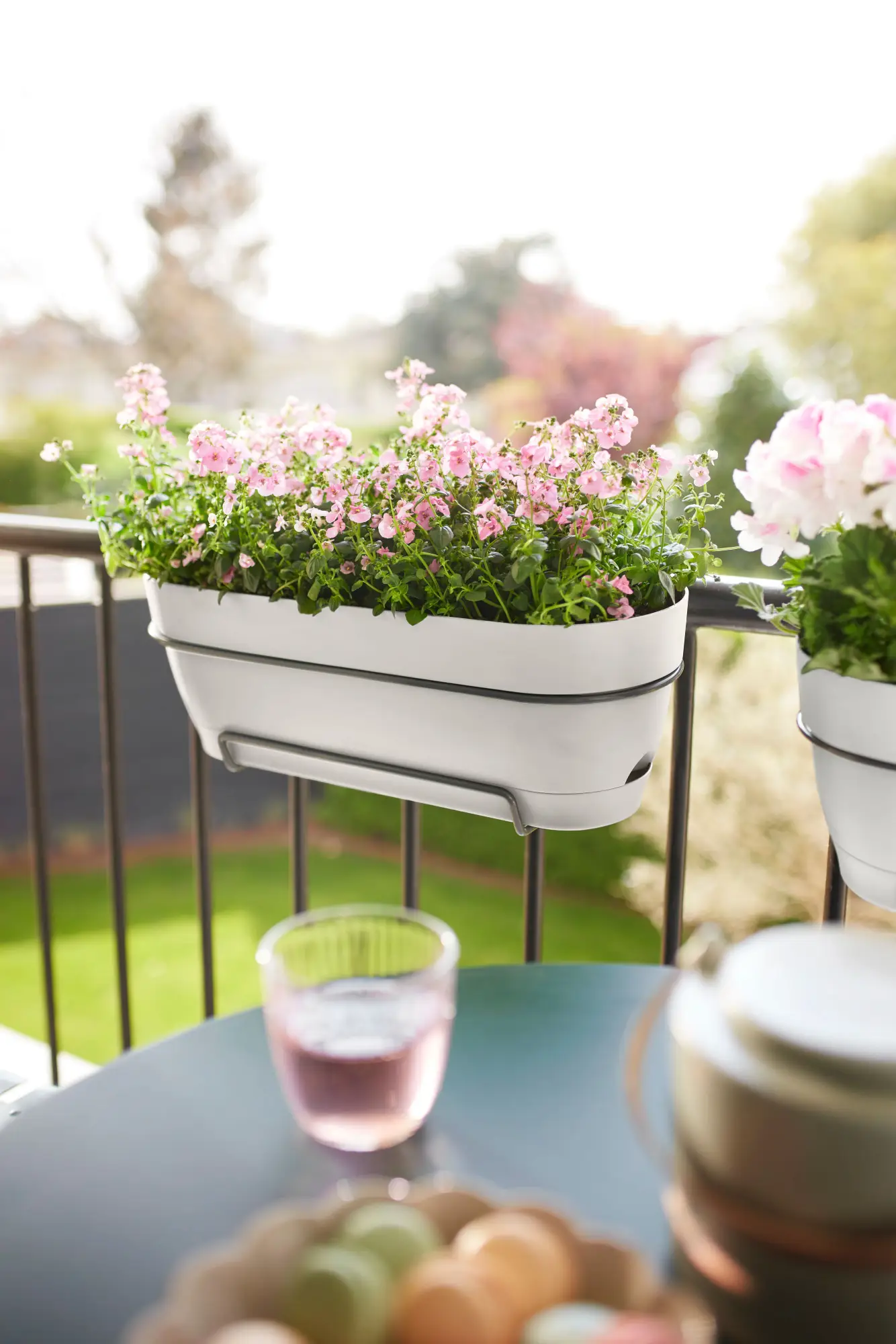Met deze duurzaam geproduceerde balkonbak in trendy kleuren kun je balkonrelingen, schuttingen en vensterbanken op een moderne manier vergroenen en je huis omtoveren tot een groene oase. Alleen of in combinatie met andere plantenbakken uit de vibia serie is deze balkonbak altijd een geweldige blikvanger die je planten altijd van voldoende water voorziet dankzij het geïntegreerde waterreservoir.