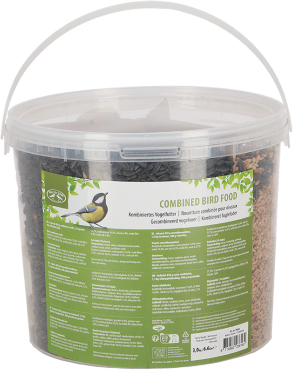 Deze voermix van 3 kg voorziet wilde vogels het hele jaar door van waardevolle energie. De mix van strooivoer en vetbollen is rijk aan vetten en voedingsstoffen en ondersteunt de gevederde tuinbewoners, vooral in de koude maanden. De hersluitbare emmer beschermt het voer betrouwbaar tegen knaagdieren, is gemakkelijk te vervoeren en kan worden gestapeld om ruimte te besparen.