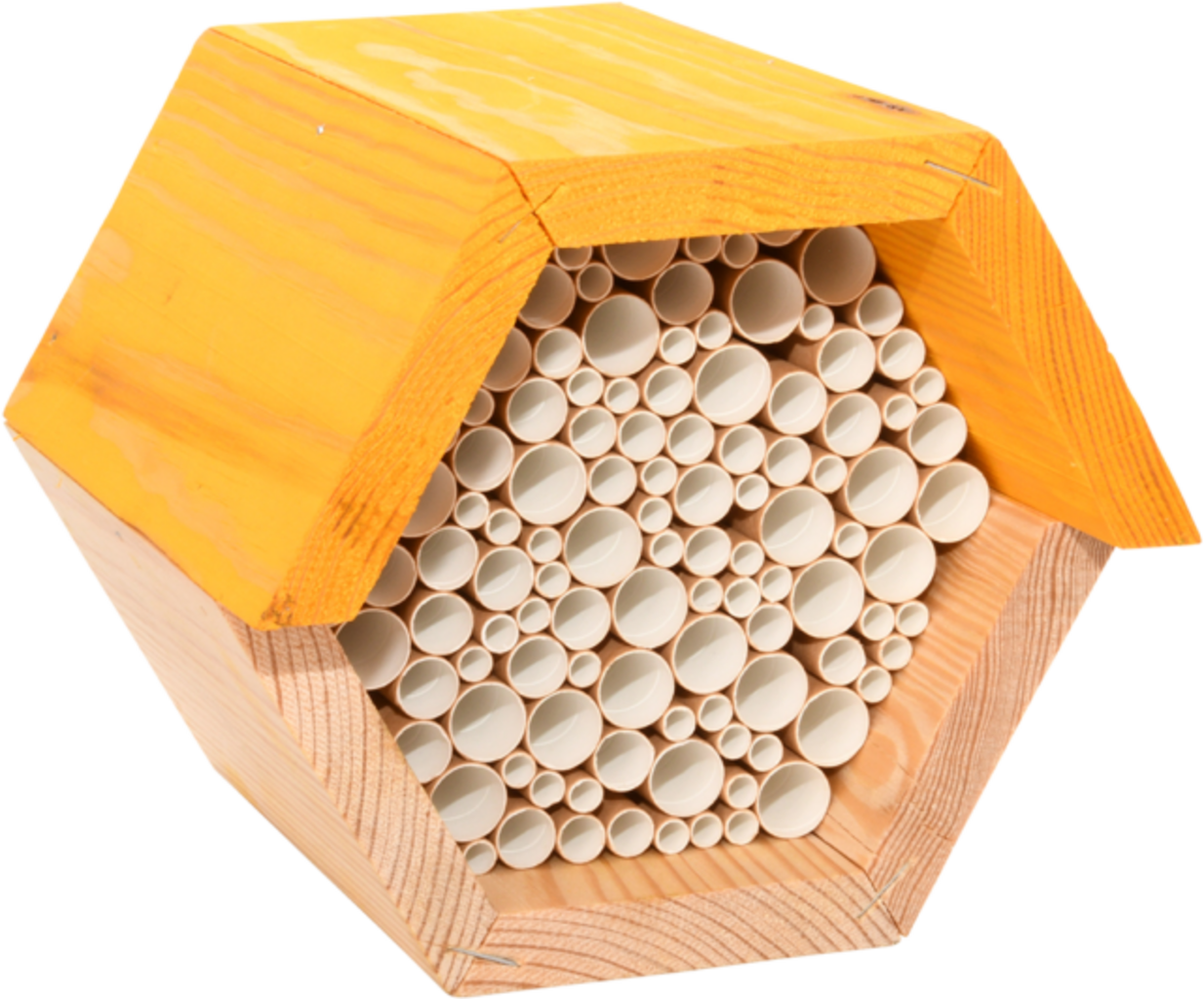 Dit zeshoekige bijenhuis is een waardevolle steun voor wilde bijen in de tuin. De kartonnen kokers bieden ideale omstandigheden om te nestelen: elke cel wordt zorgvuldig door de bijen gevuld met eitjes, stuifmeel en nectar. Door het huisje op een zonnige plek op het zuiden te zetten, draagt het actief bij aan het behoud van de biodiversiteit.