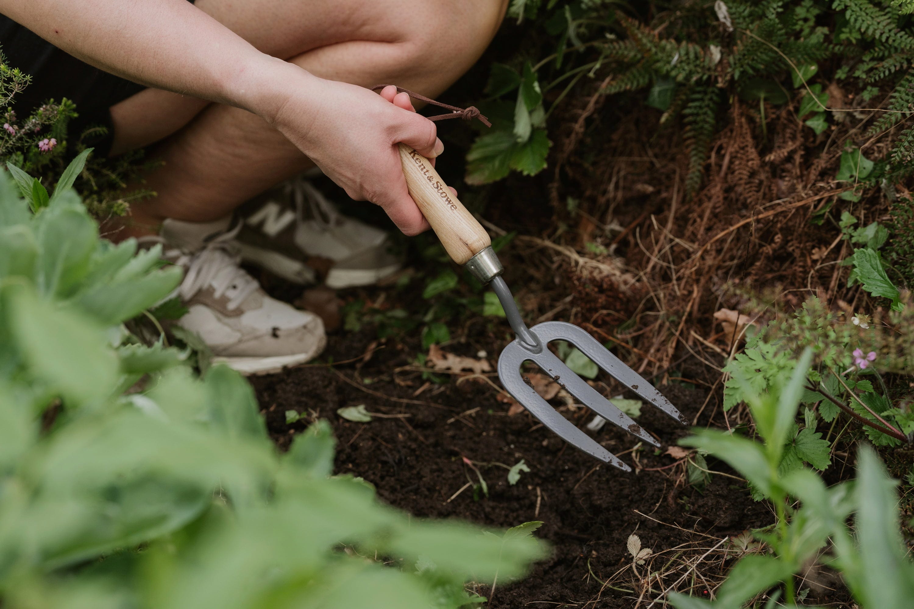 Deze hoogwaardige handvork is een essentieel hulpmiddel bij het planten en verpotten, evenals bij talloze andere werkzaamheden in de tuin. Dankzij de spits toelopende tanden glijdt de vork moeiteloos door de grond en pakt hij onkruid direct bij de wortel aan.