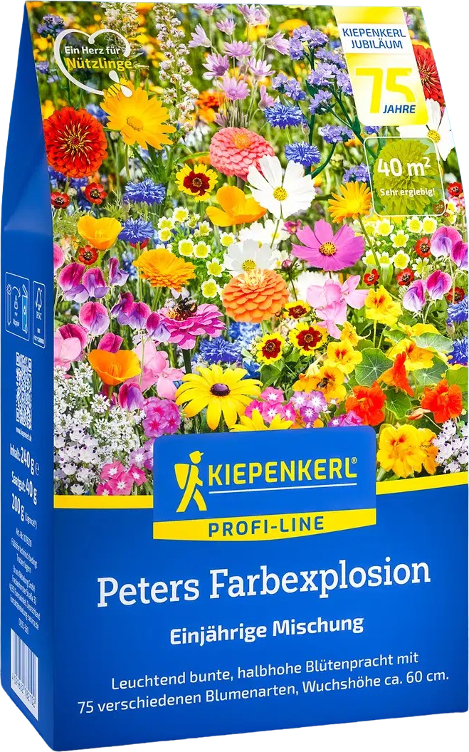 De bloemenmix "Peters Farbexplosion" brengt een kleurrijk vuurwerk van 75 zorgvuldig geselecteerde zomerbloemen in de tuin. Halfhoge, opgaande en licht overhangende planten creëren gevarieerde bloembedden en tuinpaden. Ideaal voor zonnige tot halfschaduwrijke locaties, insectenvriendelijk en met geurende bloemen - een echte blikvanger voor elke tuinliefhebber.