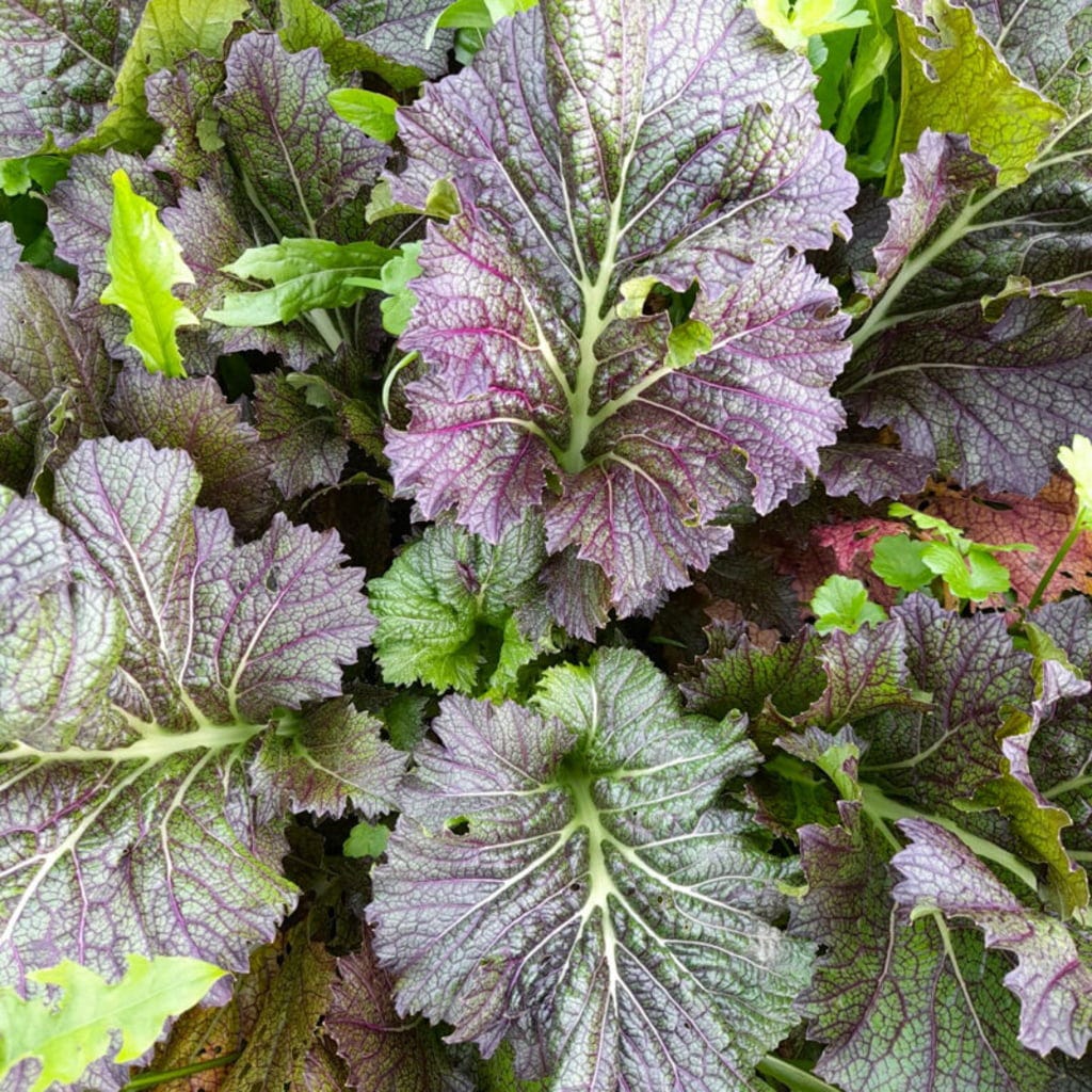 De "Dragon Tongue" Indiase mosterd produceert heldergroene bladeren met paarse accenten en witte stelen. Zijn delicate mosterdsmaak maakt hem ideaal voor salades, groenteschotels en kruiden.