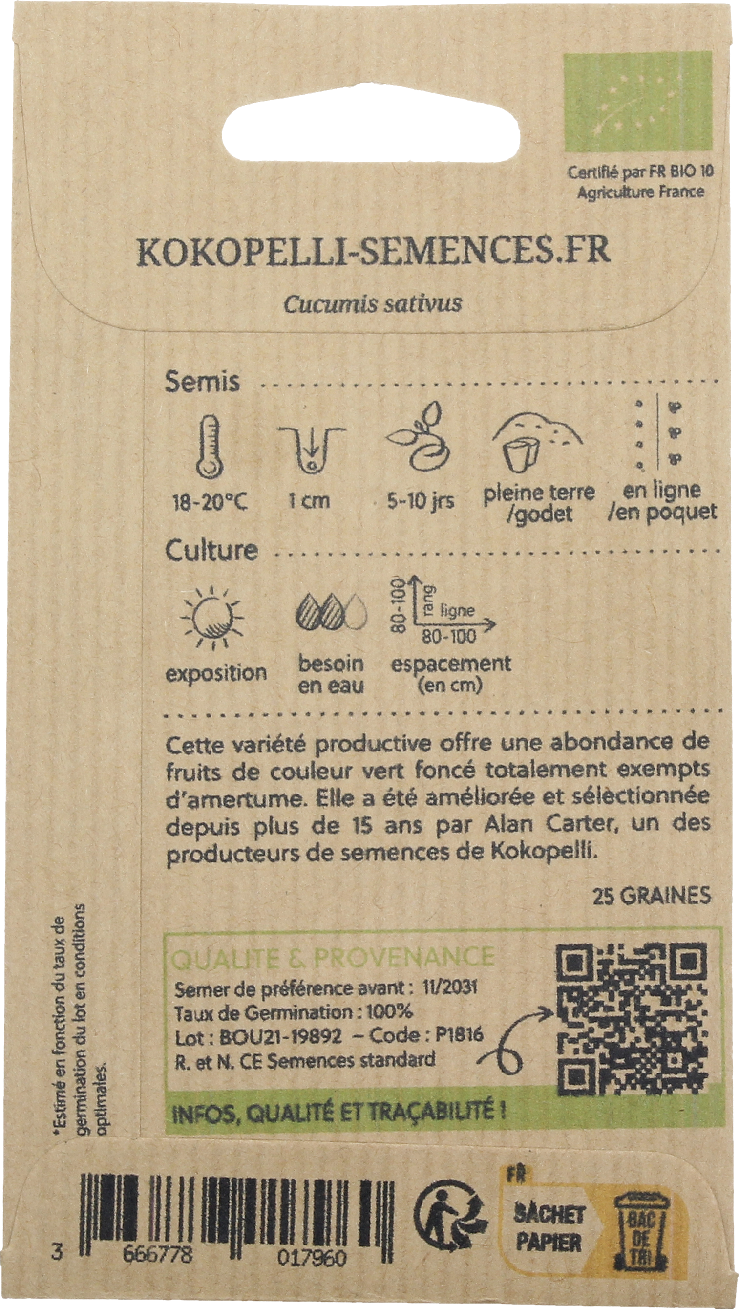 Kokopelli Biologische Komkommer "Langer Grüner von Alan", 25 Korrels