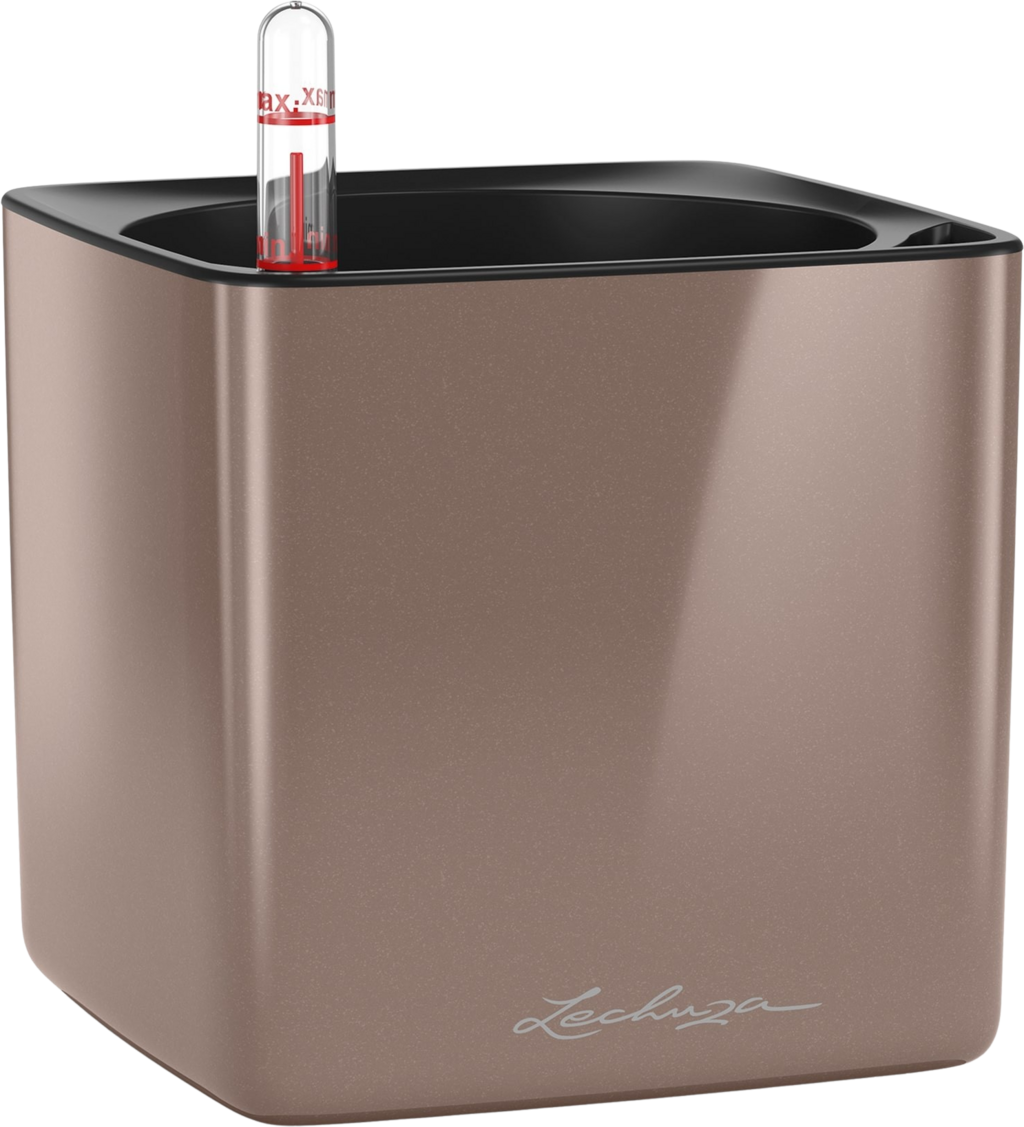 Het Lechuza bewateringssysteem zorgt ervoor dat het watergeven van de planten niet te veel tijd in beslag neemt. Planten kunnen eenvoudig samen met de groeipot in de potten uit de Cube Premium-collectie worden geplaatst, zonder dat ze tijdrovend moeten worden verpot. Een stok die van onderaf in de kweekpot wordt gestoken, transporteert het vocht gelijkmatig naar de wortels. De waterniveau-indicator kan worden gebruikt om te controleren wanneer het tijd is om opnieuw water te geven.
