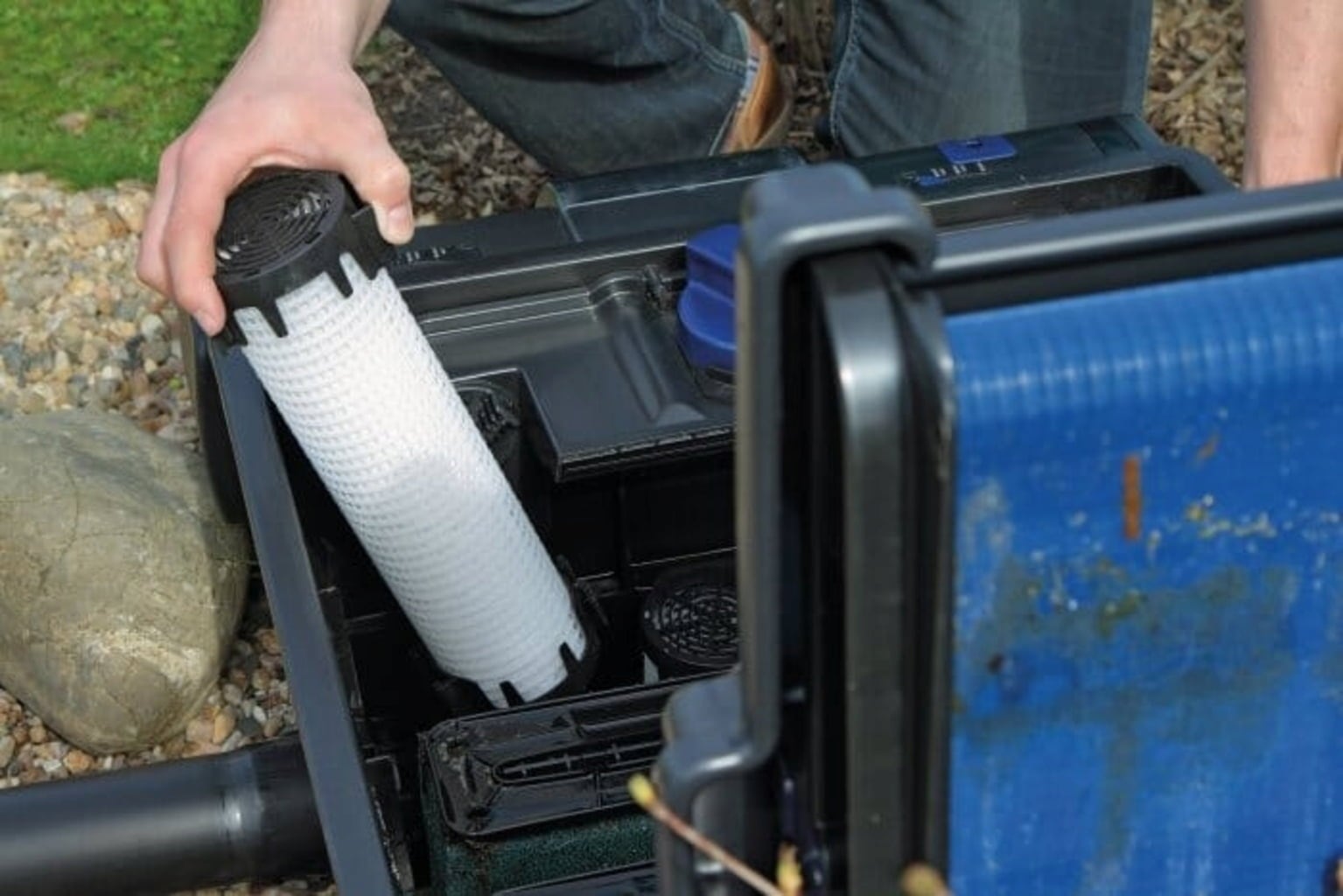 - De fabrikant raadt aan het filter te vervangen in het vroege voorjaar, wanneer er een meetbare toename van fosfaat is, wanneer er een merkbare toename van algengroei is of na het introduceren van in totaal 5 kg visvoer.