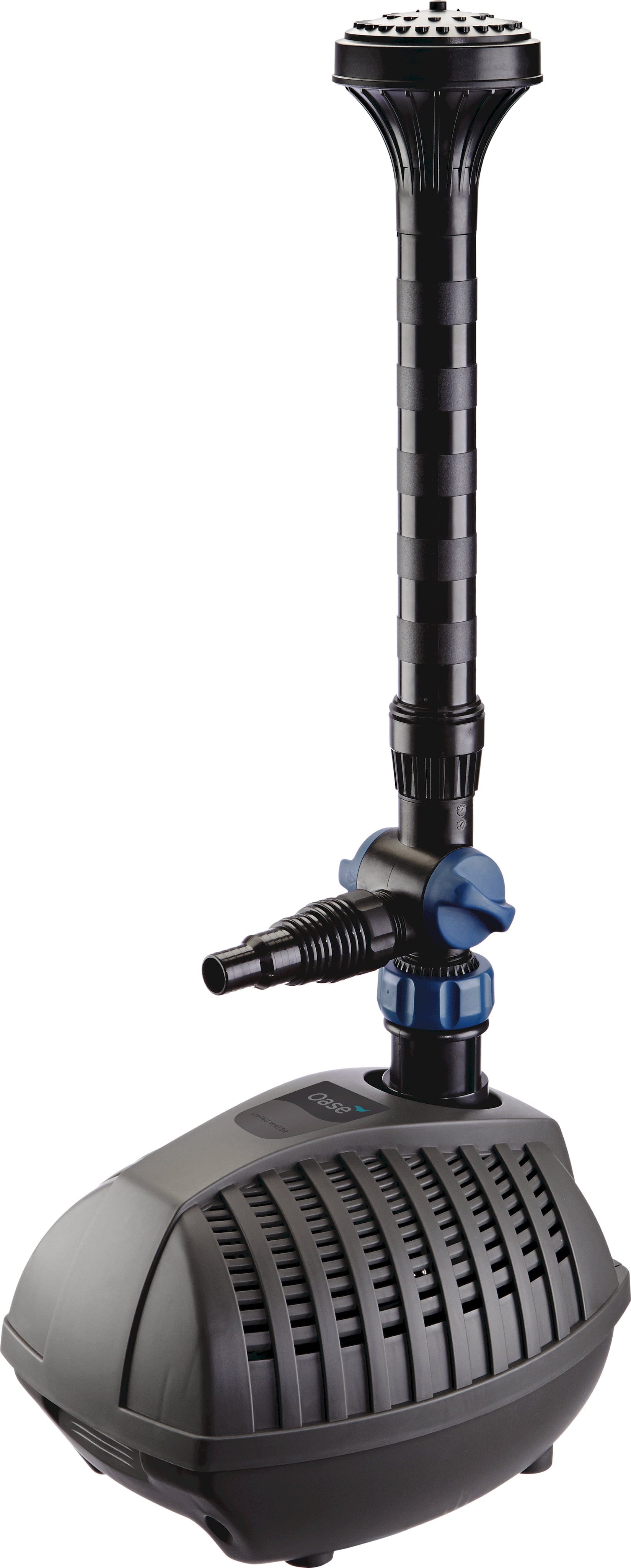 Een slim detail is de tweede, individueel regelbare uitgang, waarmee je eenvoudig parallel aan de fontein een kleine beekloop kunt laten kabbelen of een decoratieve waterspuwer kunt gebruiken. Een speciale adapter met een fijn filterscherm van roestvrij staal houdt vuildeeltjes betrouwbaar tegen voor een blijvend helder en gelijkmatig spuitbeeld.
