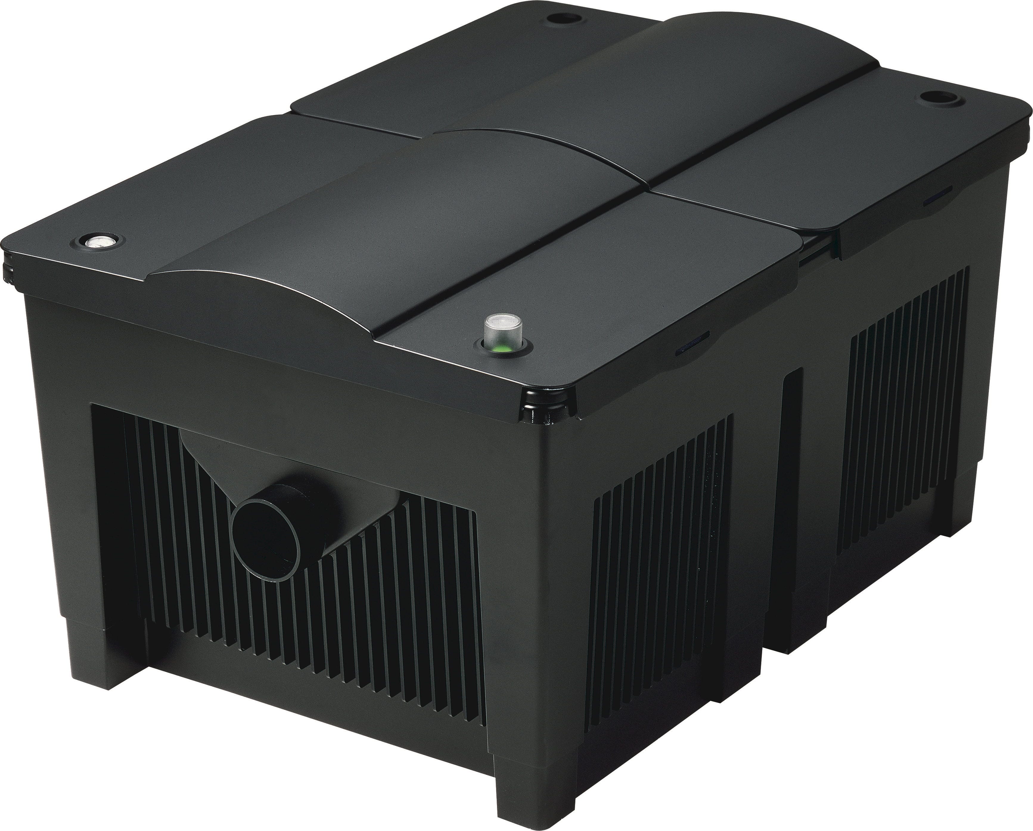 Een speciaal pluspunt voor jouw vissen is de speciale watergeleiding die het vijverwater bij het doorstromen extra verrijkt met levensnoodzakelijke zuurstof en zo voor een goed klimaat zorgt. Om altijd het volledige overzicht te behouden, zijn praktische indicatoren voor de actuele watertemperatuur en de mate van vervuiling direct op de behuizing geïntegreerd.