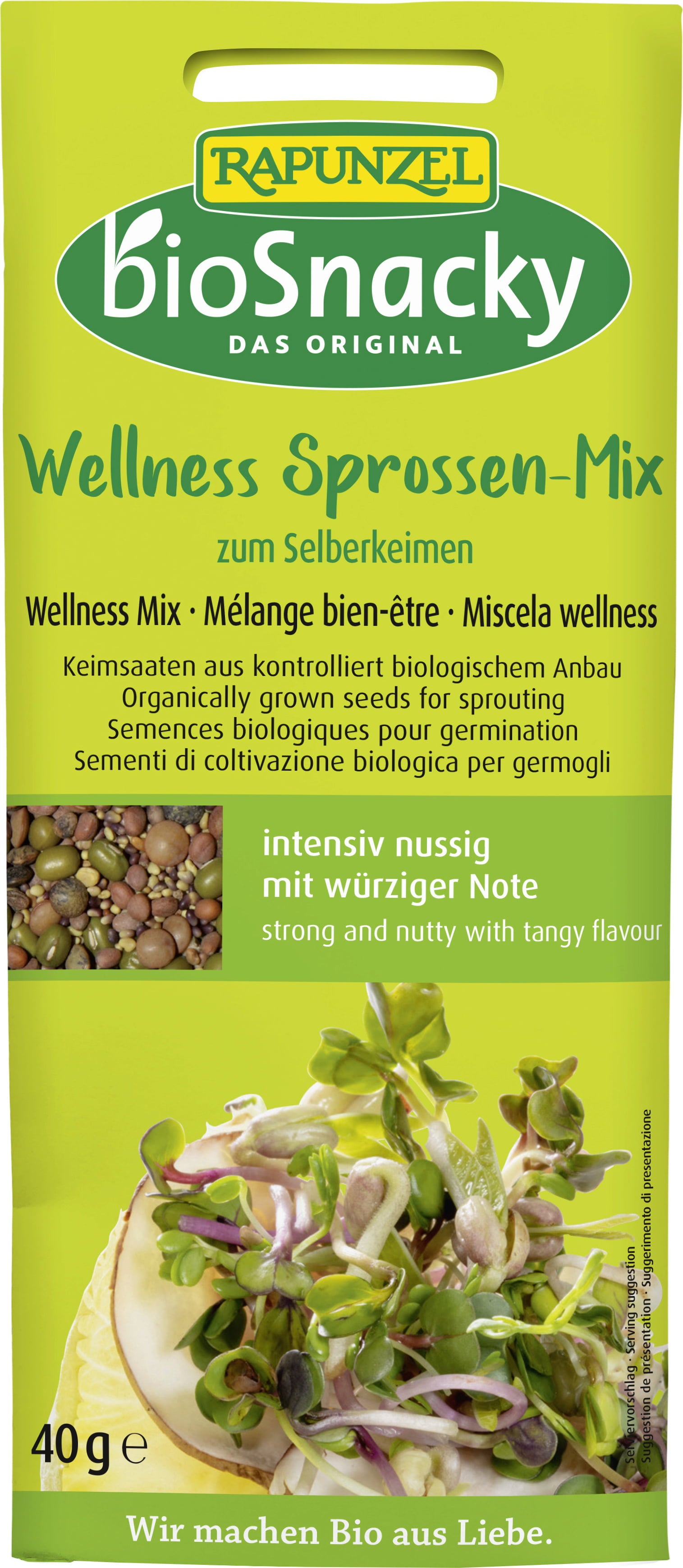 De Rapunzel bioSnacky Wellness kiemmix heeft een intens nootachtige en kruidige smaak. Dankzij de snelle en makkelijke teelt kun je het hele jaar door in elk seizoen van de kiemen genieten. Ze zijn perfect op brood, in soepen en salades of om de meest uiteenlopende gerechten mee te garneren.