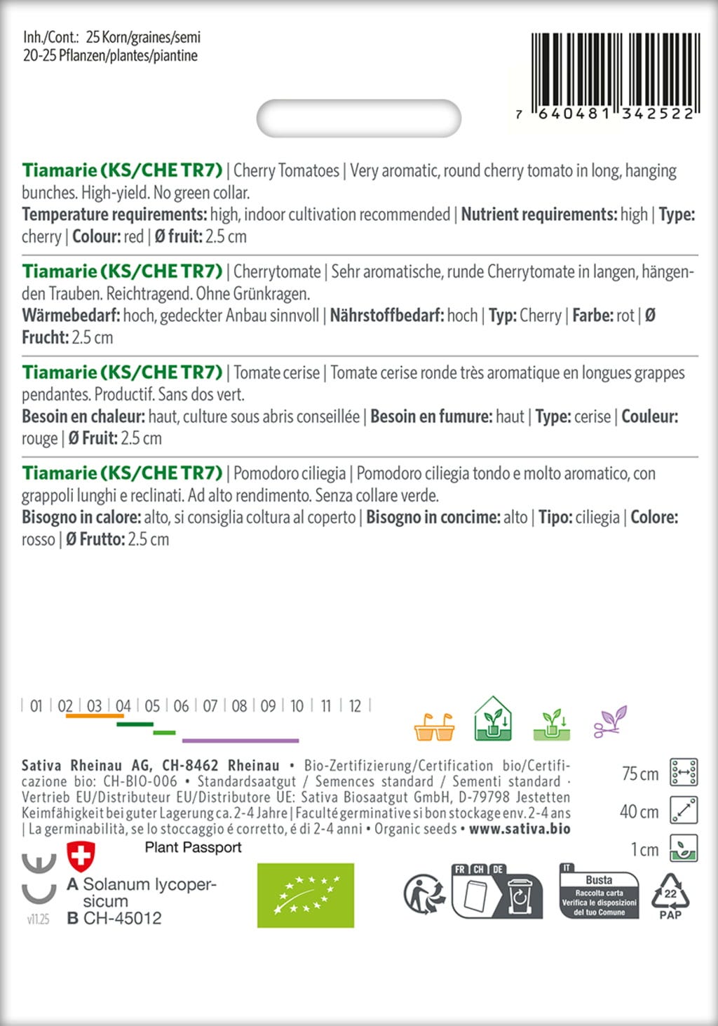De cherrytomaat Tiamarie maakt indruk met zijn aromatische, ronde vruchten die in lange, hangende trossen groeien. Hij heeft een hoge opbrengst en is bijzonder sappig. Dankzij de zuivere vruchtbodem zonder groene kraag is de plant ook mooi om te zien.