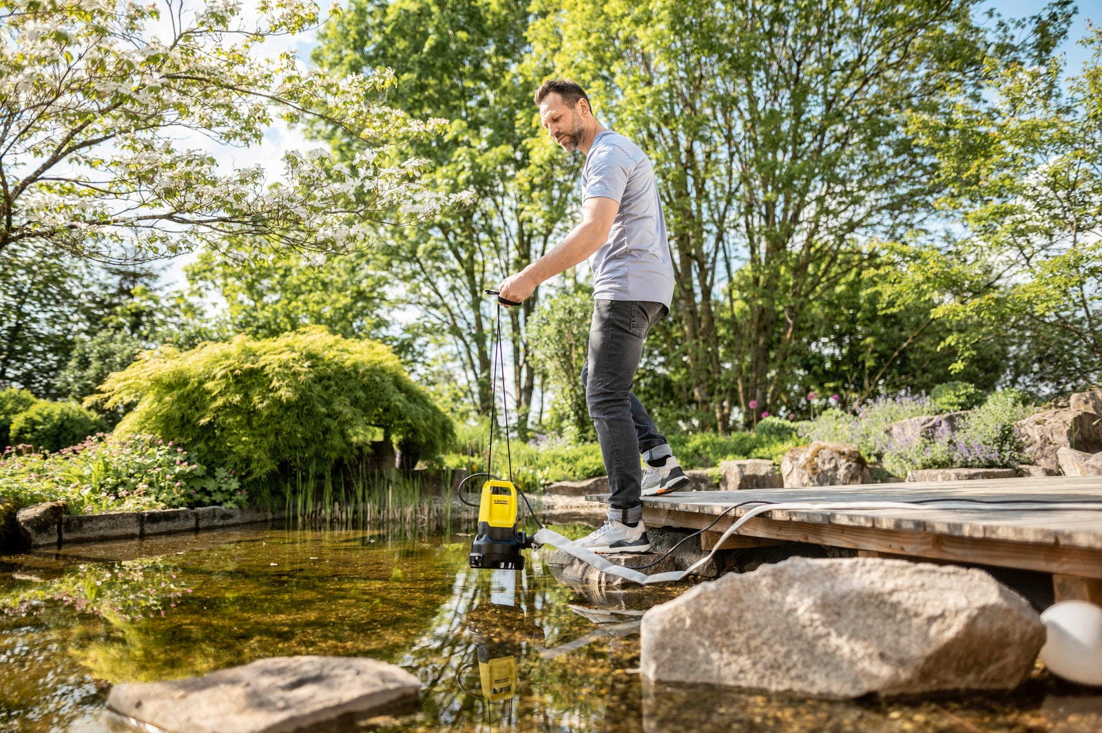 Dankzij de geïntegreerde 2-in-1-functie kan de pomp flexibel worden ingezet. In vuilwatermodus kunnen waterverzamelingen met deeltjes tot een korrelgrootte van 20 mm worden weggepompt, bijvoorbeeld bij gebruik als dompelpomp voor bouwput of bij het legen van een vijver. Als het filtermandje op vlakzuiging wordt ingesteld, maakt de pomp een nagenoeg veegdroge ontwatering tot 1 mm restwater mogelijk – handig bij het wegpompen van kelderruimtes of zwembaden.