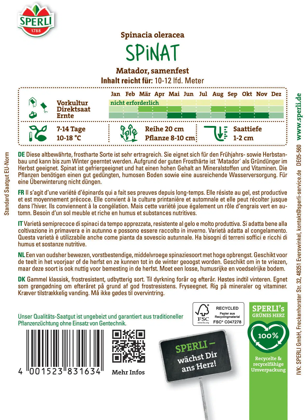 Spinazie 'Matador' is een bewezen, middelvroege variëteit die zowel in de lente als in de herfst kan worden gezaaid. De sterke groene bladeren zijn hoogproductief, vorstbestendig en perfect voor verse consumptie of om in te vriezen. Voor een optimale groei moeten de zaden worden gezaaid op een zonnige tot halfschaduwrijke plek en in humusrijke, losse grond.