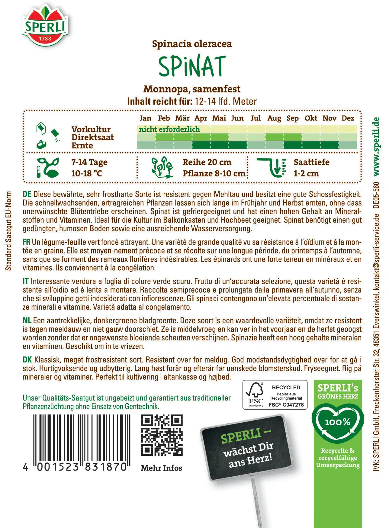 Spinazie 'Monnopa' is gemakkelijk te kweken en produceert hoogproductieve, aantrekkelijke donkergroene bladeren. Voor een optimale oogst moeten de planten in goed bemeste, humusrijke grond worden geplant en regelmatig water krijgen. Ideaal voor verse salades, stomen of invriezen.