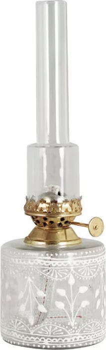 Deze elegante, slanke paraffinelamp van helder glas maakt indruk met zijn eenvoudige ontwerp en mooie witte bloemen. De messingkleurige brander en de heldere branderbuis geven de lamp een charmante vintage look die perfect harmonieert met moderne woonstijlen. Ideaal als sfeervolle lichtbron op balkons, terrassen of in gezellige interieurs.