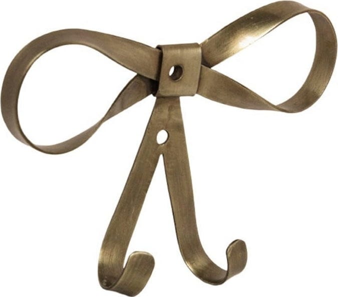 Deze wandhaak geeft elke ruimte een elegante vintage touch. De charmante strikvorm en de antiek-messing look maken van deze haak een decoratief hoogtepunt, terwijl de twee haken bijzonder praktisch zijn voor het ophangen van kleding, tassen of accessoires.